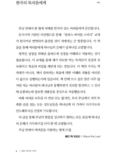 주님 안에서 한 형제 자매된 한국의 성도 여러분에게 문안합니다. 문서사역 기관인 미션월드를 통해 '컴파스 바이블 스터디'시리즈가 한국어로 번역되어 출간됨을 저에게는 큰 영광입니다. 이 시리즈를 통해 여러분에게 하나님의 은혜가 넘쳐나길 소망합니다.