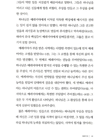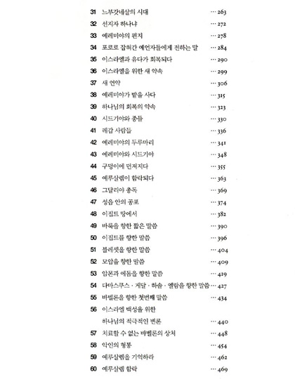 | 예레미야 1. 예레미야 1:1-19 2. 예레미야 2:1-19 3. 예레미야 2:20-37 4. 예레미야 3:1-25 5. 예레미야 4장 6. 예레미야 5장 7. 예레미야 6장 8. 예레미야 7장 9. 예레미야 8장 10. 예레미야 9장 11. 예레미야 10:1-16 12. 예레미야 10:17-25 13. 예레미야 11장 14. 예레미야 12장 15. 예레미야 13:1-11 16. 예레미야 13:12-27 17. 예레미야 14장 18. 예레미야 15장 19. 예레미야 16장 20. 예레미야 17:1-13 21. 예레미야 17:14-27 22. 예레미야 18장 23. 예레미야 19장 24. 예레미야 20장 25. 예레미야 21장 26. 예레미야 22장 27. 예레미야 23장 28. 예레미야 24장 29. 예레미야 25장 30. 예레미야 26장 31. 예레미야 27장 32. 예레미야 28장 33. 예레미야 29:1-14 | 34. 예레미야 29:15-32 35. 예레미야 30장 36. 예레미야 31:1-17 37. 예레미야 31:18-40 38. 예레미야 32장 39. 예레미야 33장 40. 예레미야 34장 41. 예레미야 35장 42. 예레미야 36장 43. 예레미야 37장 44. 예레미야 38장 45. 예레미야 39장 46. 예레미야 40:1-41:3 47. 예레미야 41:4-42:22 48. 예레미야 43-44장 49. 예레미야 45장 50. 예레미야 46장 51. 예레미야 47장 52. 예레미야 48장 53. 예레미야 49:1-22 54. 예레미야 49:23-39 55. 예레미야 50:1-16 56. 예레미야 50:17-46 57. 예레미야 51:1-12 58. 예레미야 51:13-40 59. 예레미야 51:41-64 60. 예레미야 52장 예레미야애가 1. 예레미야애가 1장 2. 예레미야애가 2장 3. 예레미야애가 3:1-27 4. 예레미야애가 3:28-66 5. 예레미야애가 4장 6. 예레미야애가 5장 |