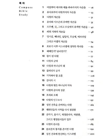 컴파스 바이블 스터디는 성도들이 성경 66권을 스스로 연구할 수 있도록 쉽게 쓰여진 탁월한 교재입니다. 내용이 이야기 형식으로 쉽게 쓰여져 있어서 말씀에 담겨진 하나님의 마음을 이해 할수 있습니다.신약 11권, 구약 16권, 모두 27권입니다.개인적인 성경연구 교재로, 가정예배 교재로, 교회 새벽예배시 전교인 교재로, 구역예배 및 소그룹 성경연구에 가장 적합한 교재입니다.