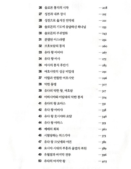 | 역대상·하 1. 아담부터 에서와 에돔 족속까지의 자손들 2. 유다로부터 다윗까지의 자손들 3. 다윗의 자손들 4. 유다와 시므온의 유력한 자손들 5. 르우벤, 갓, 그리고 므낫세의 유력한 자손들 6. 레위 지파의 자손들 7. 잇사갈, 베냐민, 납달리, 므낫세, 에브라임 그리고 아셀의 자손들 8. 포로기 이후 이스라엘에 정착한 족속들 9. 패배인가? 승리인가? 10. 왕이 된 다윗 11. 다윗의 군대 12. 다윗과 하나님의 궤 13. 블레셋의 공격 14. 기억해야 할 교훈 15. 감사의 시 16. 다윗과 맺은 하나님의 약속 17. 다윗의 군사적 성공 18. 호의와 오해 19. 다윗의 인구조사 20. 성전 건축을 준비하는 다윗 21. 레위인들의 사역을 다시 점검함 22. 음악가, 문지기, 재정관리자, 재판관, 그리고 행정관리들의 업무 23. 다윗의 관리들 24. 솔로몬의 통치를 준비한 다윗 25. 성전 건축에 헌신하는 이스라엘 26. 솔로몬 통치의 시작 27. 성전과 내부 장식 28. 성전으로 옮겨진 언약궤 29. 솔로몬의 기도에 응답하신 하나님 30. 솔로몬의 부귀영화 31. 분열된 이스라엘 32. 르호보암의 통치 33. 유다 왕 아비야 34. 유다 왕 아사 35. 아사의 통치 후반기 36. 여호사밧의 성공 비밀 37. 아합과 연합한 여호사밧 38. 악한 동맹 39. 유다의 악한 왕, 여호람 40. 아하시야와 아달랴의 악한 통치 | 41. 유다의 왕 요아스 42. 유다 왕 아마샤 43. 유다 왕 웃시야와 요담 44. 유다 왕 아하스 45. 예배의 회복 46. 시험당하는 히스기야 47. 유다 왕 므낫세와 아몬 48. 요시아 시대의 부흥과 율법의 복원 49. 유월절과 마지막 전투 50. 유다의 마지막 왕 에스라 1. 고레스의 선포 2. 돌아온 사람들 3. 성전 건축을 시작하다 4. 아닥사스다 왕에게 보낸 편지 5. 학개의 도전 6. 성전이 완공되다 7. 에스라가 예루살렘에 이르다 8. 에스라와 함께 돌아온 백성들 9. 백성들의 죄 10. 회복 느헤미야 1. 느헤미야의 기도 2. 느헤미야의 요청 3. 성벽 재건을 시작하다 4. 일하며 경계하며 5. 내부의 문제들 6. 개인적인 공격 7. 예루살렘에 정착하다 8. 광장에서 열린 집회 9. 잊혔던 축제의 회복 10. 반역하는 인간, 신실하신 하나님 11. 견고한 언약 12. 백성들이 그 땅에 정착하다 13. 성벽 봉헌 14. 영적 청소 에스더 1. 왕후 와스디의 불순종 2. 새로운 왕후 찾기 3. 하만과 모르드개 4. 죽으면 죽으리라 5. 잔치와 교수대 6. 적절한 때에 이루어진 보상 7. 하만의 음모가 역전됨 8. 부림절: 승리를 축하함 |