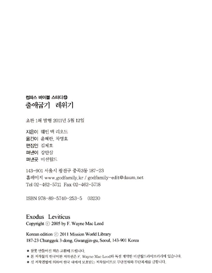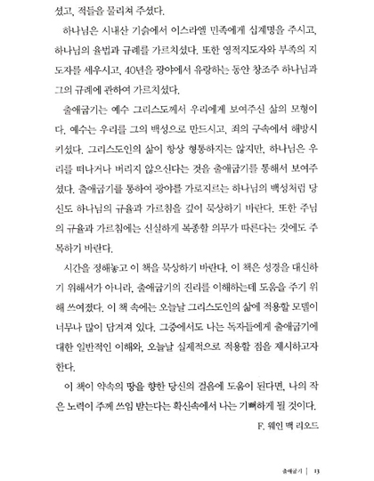 출애굽기를 통하여 광야를 가로지르는 하나님의 백성처럼 하나님의 규율과 가르침을 깊이 묵상하세요. 또한 주님의 규율과 가르침에는 신실하고 복종할 의무가 따른다는 것에 주목하기 바랍니다. 레위기에 서술된 하나님이 원하시는 백성들의 살아가는 모습을 보면서 우리는 하나님의 본성과 사역에 대해 배우게 되며, 하나님이 어떤 분인지 온전하게 배우고, 오늘 우리가 하나님과 올바른 교제를 나누지 못하는 이유도 깨닫게 될 것입니다. 레위기는 하나님과 우리가 친밀한 관계를 만들어 가는데 필요한 중요한 도구입니다.