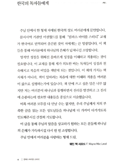 주님 안에서 한 형제 자매된 한국의 성도 여러분에게 문안합니다. 문서사역 기관인 미션월드를 통해 '컴파스 바이블 스터디'시리즈가 한국어로 번역되어 출간됨을 저에게는 큰 영광입니다. 이 시리즈를 통해 여러분에게 하나님의 은혜가 넘쳐나길 소망합니다.
