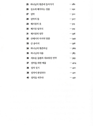 출애굽기 1. 종이 된 이스라엘 2. 모세의 유년시절 3. 부르심을 받은 모세 4. 애굽으로 돌아온 모세와 아론 5. 상황이 악화되기만 할 때 6. 모세와 아론의 자격 7. 타협은 없다 8. 저항을 멈추지 않는 바로 9. 계속되는 재앙 10. 마지막 재앙 11. 유월절 12. 이스라엘이 애굽을 떠나다 13. 믿음 안에서 얻는 교훈 14. 구원의 노래 15. 다른 시험, 다른 응답 16. 물 부족과 적의 공격 17. 이드로의 현명한 조언 18. 시내산에서 하나님을 만나다 19. 십계명 20. 존중하는 삶 21. 다른 사람의 재산에 대한 존중 22. 사회적인 임무와 영적인 임무 23. 정의와 진리와 공평함 24. 절기와 제물 25. 하나님의 현존에 들어가기 26. 성소에 배치되는 성물 27. 성막 28. 성막의 뜰 29. 제사장의 옷 30. 제사장 임직식 31. 제사장의 임무 32. 산에서의 마지막 말씀 33. 금 송아지 34. 하나님의 현존하심 | 35. 하나님의 이름 36. 새로운 돌판과 새로워진 언약 37. 성막을 위한 예물 38. 성막 짓기 39. 완성된 성막 40. 성막 세우기 레위기 1. 번제 2. 소제 3. 화목제 4. 속죄제 5. 속건제 6. 제사에 대한 규정들(1부) 7. 제사에 대한 규정들(2부) 8. 아론과 그의 아들들의 제사장 위임식 9. 영광을 드러내시는 하나님 10. 나답과 아비후가 준 교훈 11. 정결한 동물들과 부정한 동물들 12. 출산 13. 피부병에 대한 규정들 14. 환자의 정결 규례 15. 부정한 유출병 16. 속죄일 17. 제물 드리는 곳 18. 성 생활에 대한 규정 19. 거룩하라 20. 특정한 죄들에 대한 처벌 21. 제사장들을 위한 규례 22. 성물에 대한 규례 23. 거룩한 모임들 24. 하나님의 거룩한 장소와 거룩한 이름 25. 안식년과 희년 26. 축복과 저주 27. 서원에 관한 규정 |