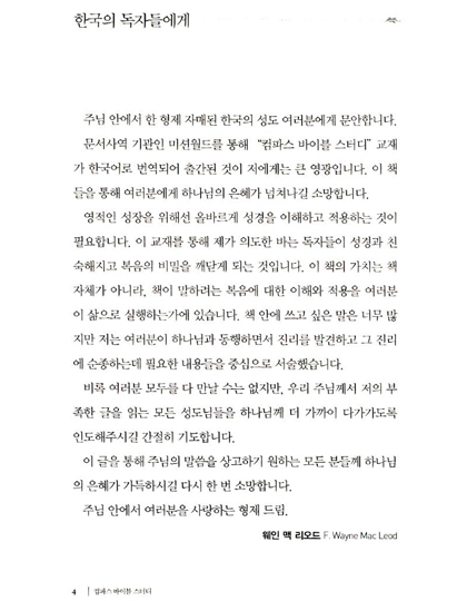 주님 안에서 한 형제 자매된 한국의 성도 여러분에게 문안합니다. 문서사역 기관인 미션월드를 통해 '컴파스 바이블 스터디'시리즈가 한국어로 번역되어 출간됨을 저에게는 큰 영광입니다. 이 시리즈를 통해 여러분에게 하나님의 은혜가 넘쳐나길 소망합니다.