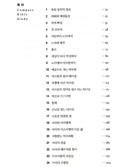 컴파스 바이블 스터디는 성도들이 성경 66권을 스스로 연구할 수 있도록 쉽게 쓰여진 탁월한 교재입니다. 내용이 이야기 형식으로 쉽게 쓰여져 있어서 말씀에 담겨진 하나님의 마음을 이해 할수 있습니다.신약 11권, 구약 16권, 모두 27권입니다.개인적인 성경연구 교재로, 가정예배 교재로, 교회 새벽예배시 전교인 교재로, 구역예배 및 소그룹 성경연구에 가장 적합한 교재입니다.