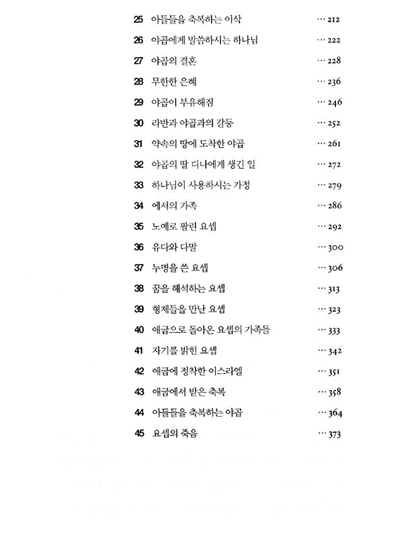 1. 육일 동안의 창조 2. 하와와 에덴동산 3. 죄에 빠짐 4. 첫 살인자 5. 아담부터 노아까지 6. 노아의 방주 7. 홍수 8. 세상이 다시 번성하다 9. 노아에서 아브람까지 10. 애굽으로 가는 아브람 11. 아브람과 롯이 헤어짐 12. 전쟁에 나간 아브람 13. 아브람과 언약을 맺으시는 하나님 14. 하갈과 이스마엘 15. 할례 16. 손님을 맞는 아브람 17. 소돔을 탈출한 롯 18. 사라와 아비멜렉 19. 이삭과 이스마엘의 다른 삶 20. 시험받는 아브라함 21. 사라의 죽음 22. 이삭의 배우자를 찾다 23. 아브라함의 자손들 | 24. 이삭의 우물들 25. 아들들을 축복하는 이삭 26. 야곱에게 말씀하시는 하나님 27. 야곱의 결혼 28. 무한한 은혜 29. 야곱이 부유해짐 30. 라반과 야곱과의 갈등 31. 약속의 땅에 도착한 야곱 32. 야곱의 딸 디나에게 생긴 일 33. 하나님이 사용하시는 가정 34. 에서의 가족 35. 노예로 팔린 요셉 36. 유다와 다말 37. 누명을 쓴 요셉 38. 꿈을 해석하는 요셉 39. 형제들을 만난 요셉 40. 애굽으로 돌아온 요셉의 가족들 41. 자기를 밝힌 요셉 42. 애굽에 정착한 이스라엘 43. 애굽에서 받은 축복 44. 아들들을 축복하는 야곱 45. 요셉의 죽음 |