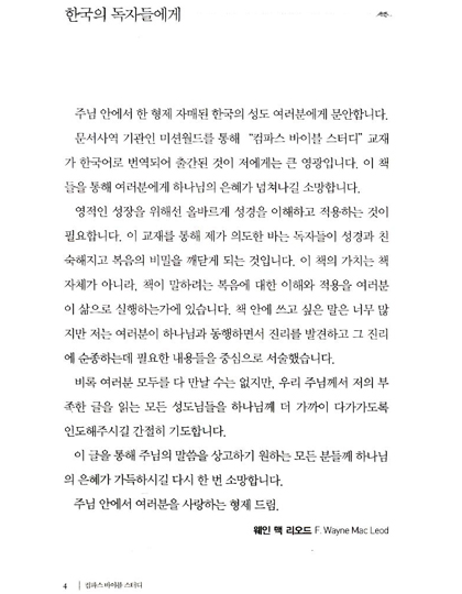 주님 안에서 한 형제 자매된 한국의 성도 여러분에게 문안합니다. 문서사역 기관인 미션월드를 통해 '컴파스 바이블 스터디'시리즈가 한국어로 번역되어 출간됨을 저에게는 큰 영광입니다. 이 시리즈를 통해 여러분에게 하나님의 은혜가 넘쳐나길 소망합니다.