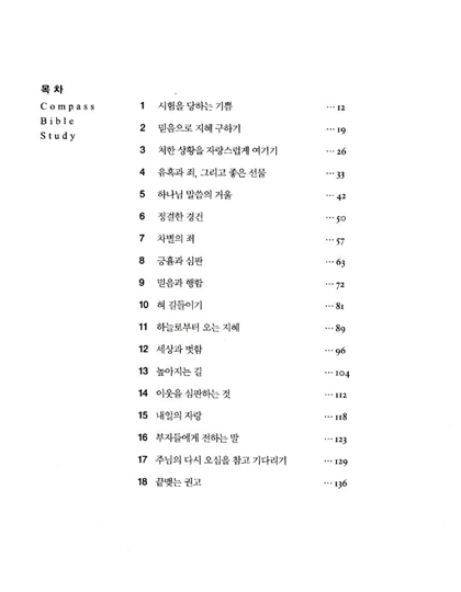 컴파스 바이블 스터디는 아주 쉽게 쓰여진 성경교재입니다. 본 교재는 학문적인 연구 뿐 아니라 삶 속에 말씀을 적용하도록 안내해주는 삶의 나침반(Compass)입니다. "성경을 읽으면서도 무슨 말인지 이해하지 못해 고심한 적이 있는가? 삶과 동떨어진 성경공부를 해 오진 않았는가?"