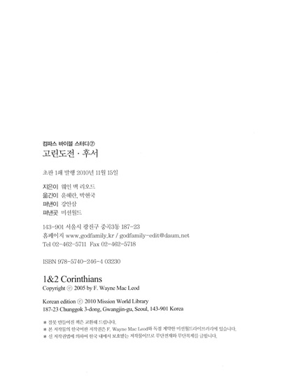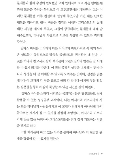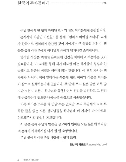 주님 안에서 한 형제 자매된 한국의 성도 여러분에게 문안합니다. 문서사역 기관인 미션월드를 통해 '컴파스 바이블 스터디'시리즈가 한국어로 번역되어 출간됨을 저에게는 큰 영광입니다. 이 시리즈를 통해 여러분에게 하나님의 은혜가 넘쳐나길 소망합니다.