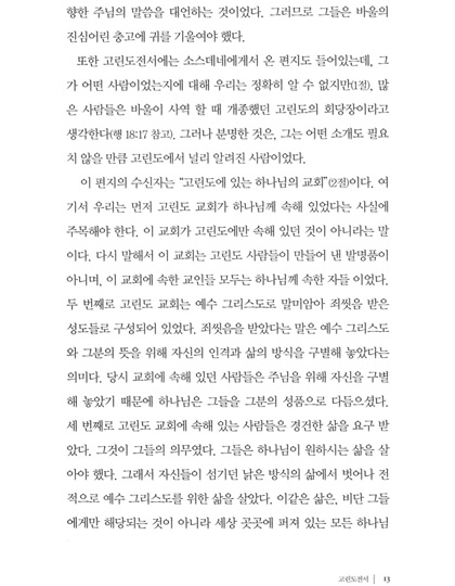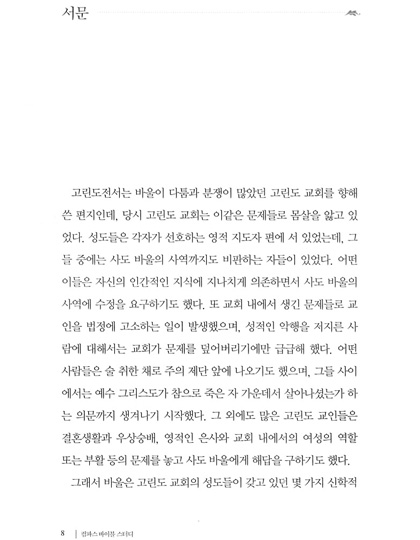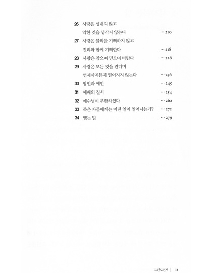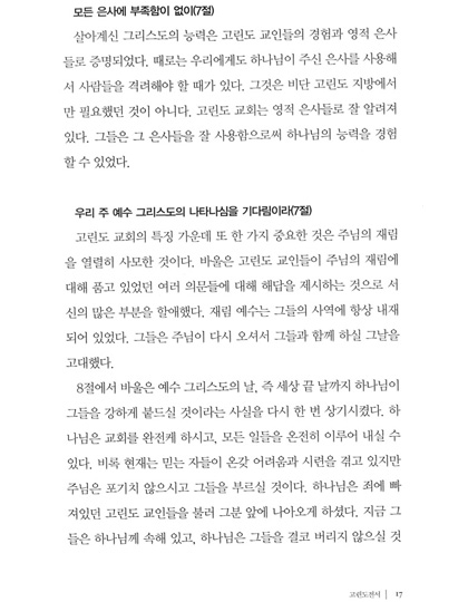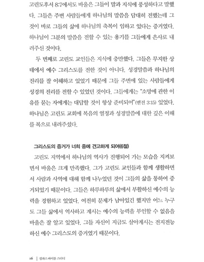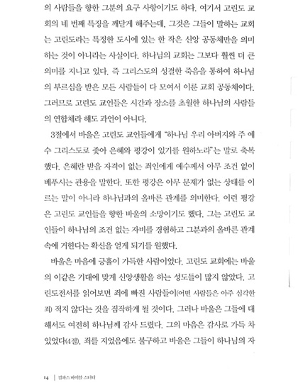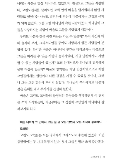 고린도 전서 1. 시작하는 말 2. 바울, 아볼로, 게바 그리고 예수 3. 인간의 지혜와 십자가 4. 십자가에 못 박히신 그리스도를 아는 것 5. 영적인 지혜 6. 고린도 교회의 분열 7. 사명에 대한 의심 8. 편안한 기독교 9. 오래된 누룩 10. 신자들 간의 송사 11. 성적인 악행 12. 결혼하는 것과 결혼하지 않는 것 13. 거룩하게 되다 14. 행복한 독신생활? 15. 제사음식 16. 바울을 본받아 17. 역사가 주는 경고 18. 자유의 한계 19. 여성들이 머리에 쓰는 수건 20. 성만찬 21. 영적인 은사 22. 한 몸 23. 사랑은 오래참고 온유하다 24. 사랑은 시기하거나 자랑하지 않는다 25. 사랑은 교만하지 않고 무례히 행치 않고 자기의 유익을 구치 않는다. 26. 사랑은 성내지 않고 악한 것을 생각지 않는다 27. 사랑은 불의를 기뻐하지 않고 진리와 함께 기뻐한다 28. 사랑은 참으며 믿으며 바란다 | 29. 사랑은 모든 것을 견디며 언제까지든지 떨어지지 않는다 30. 방언과 예언 31. 예배의 질서 32. 예수님이 부활하셨다 33. 죽은 자들에게는 어떤 일이 일어나는가? 34. 맺는 말 고린도 후서 1. 고난 중에도 평안함 2. 변경된 계획 3. 근심어린 편지 4. 장사꾼과 대사들 5. 사도의 확신 6. 영광을 비추는 벗어진 얼굴들 7. 복음의 사역 8. 박해를 당하나 부서지지 아니함 9. 이 땅의 장막 10. 그리스도의 대사들 11. 동역자들 12. 그들 속에서 나오라 13. 엄격한 편지 14. 헌금의 은혜 15. 은사의 관리 16. 헌금의 축복 17. 약한 사람, 바울? 18. 주 안에서 자랑함 19. “지극히 큰 사도들”의 공격 20. 한 조각 세상 자랑 21. 육체의 가시 22. 너희에게 폐를 끼치지 않으리라 23. 온전함을 향하여 |