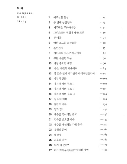 컴파스 바이블 스터디는 아주 쉽게 쓰여진 성경교재입니다. 본 교재는 학문적인 연구 뿐 아니라 삶 속에 말씀을 적용하도록 안내해주는 삶의 나침반(Compass)입니다. "성경을 읽으면서도 무슨 말인지 이해하지 못해 고심한 적이 있는가?" "삶과 동떨어진 성경공부를 해 오진 않았는가?"