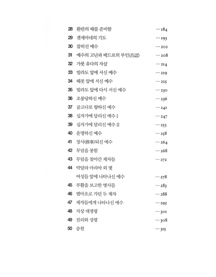 1. 예루살렘 입성 2. 두 번째 성전정화 3. 저주받은 무화과나무 4. 그리스도의 권위에 대한 도전 5. 두 아들 6. 악한 포도원 소작농들 7. 혼인잔치 8. 가이사의 것은 가이사에게 9. 부활에 관한 의문 10. 가장 중요한 계명 11. 예수, 다윗의 자손이여 12. 화 있을 진저 서기관과 바리새인들이여 13. 과부의 헌금 14. 마지막 때의 징조 I 15. 마지막 때의 징조 II 16. 마지막 때의 징조 III 17. 열 처녀 비유 18. 달란트 비유 19. 양과 염소 20. 예수를 죽이려는 음모 21. 향유를 받은 예수 22. 예수를 배신하는 가룟 유다 23. 유월절 준비 24. 배신자 25. 최후의 만찬 | 26. 누가 더 큰가? 27. 베드로의 부인(否認)에 대한 예언 28. 환란의 때를 준비함 29. 겟세마네의 기도 30. 잡히신 예수 31. 예수의 고난과 베드로의 부인(否認) 32. 가룟 유다의 자살 33. 빌라도 앞에 서신 예수 34. 헤롯 앞에 서신 예수 35. 빌라도 앞에 다시 서신 예수 36. 조롱당하신 예수 37. 골고다로 향하신 예수 38. 십자가에 달리신 예수 I 39. 십자가에 달리신 예수 II 40. 운명하신 예수 41. 장사(葬事)되신 예수 42. 무덤을 봉함 43. 무덤을 찾아간 제자들 44. 막달라 마리아 외 몇 여성들 앞에 나타나신 예수 45. 부활을 보고한 병사들 46. 엠마오로 가던 두 제자 47. 제자들에게 나타나신 예수 48. 지상 대명령 49. 진리와 성령 50. 승천 |