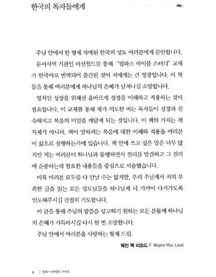 주님 안에서 한 형제 자매된 한국의 성도 여러분에게 문안합니다. 문서사역 기관인 미션월드를 통해 '컴파스 바이블 스터디'시리즈가 한국어로 번역되어 출간됨을 저에게는 큰 영광입니다. 이 시리즈를 통해 여러분에게 하나님의 은혜가 넘쳐나길 소망합니다.