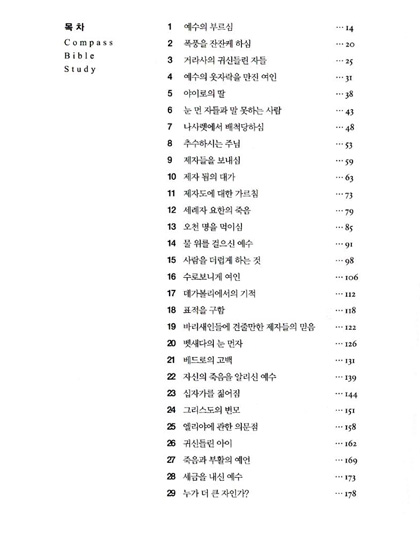 컴파스 바이블 스터디는 아주 쉽게 쓰여진 성경교재입니다. 본 교재는 학문적인 연구 뿐 아니라 삶 속에 말씀을 적용하도록 안내해주는 삶의 나침반(Compass)입니다. "성경을 읽으면서도 무슨 말인지 이해하지 못해 고심한 적이 있는가? 삶과 동떨어진 성경공부를 해 오진 않았는가?"
