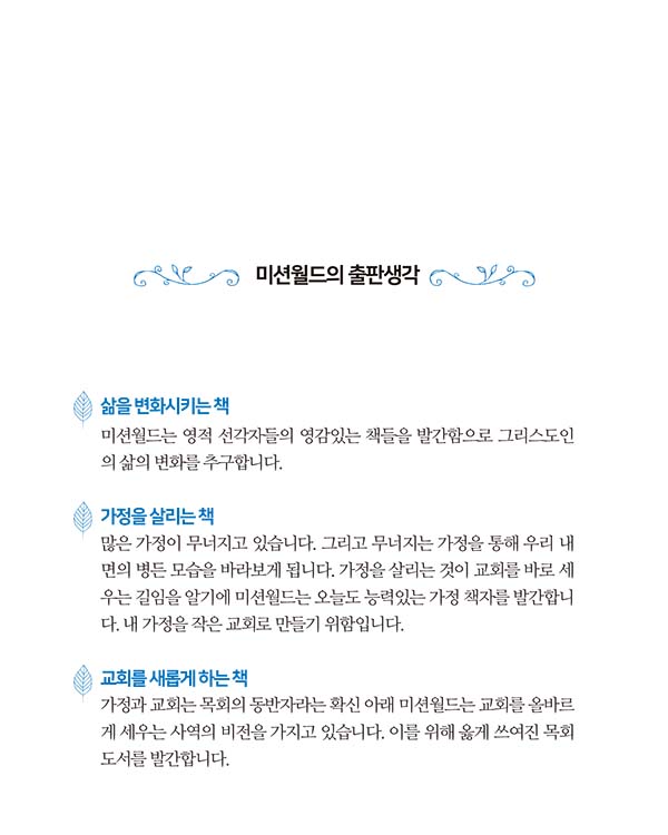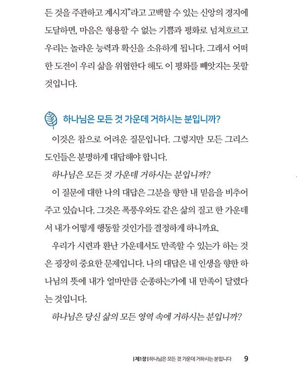 께 맡겨 버릴 수 있습니다. 주님께서 우리에게 그렇게 권고하고 계시기 때문입니다 (벧전 5:7) . 하나님은 우리가 근심과 두려움 속에서 살기를 바라지 않으십니다. 하나님은 우리가 기쁨과 평강 속에서 충만함을 누리며 살아가기를 원하십니다.”