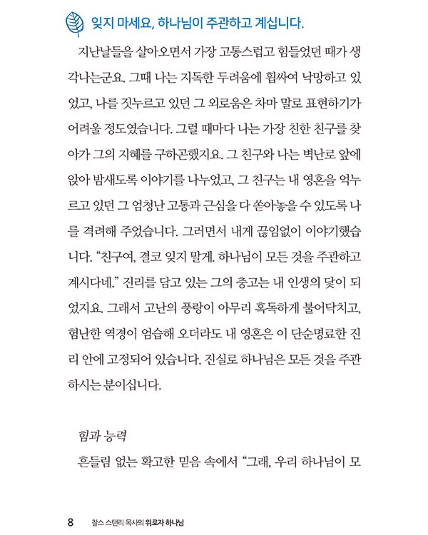 이 책의 저자인 찰스 스탠리 목사는 삶에 지쳐있는 우리들에게 하나님의 강력한 소망과 위로의 메시지를 전해줍니다.