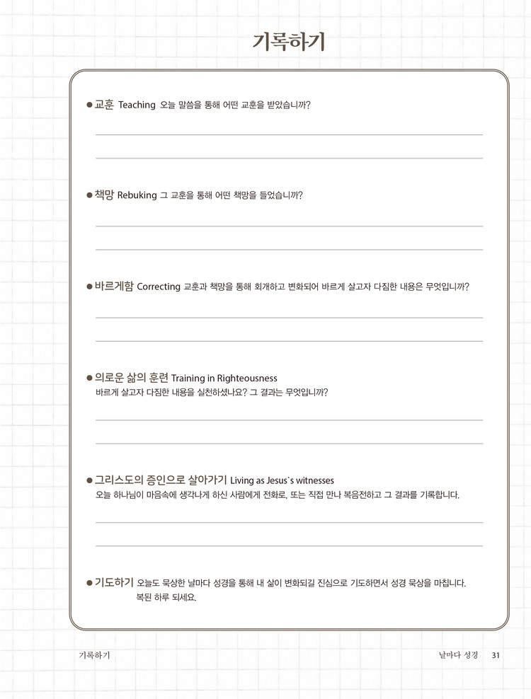 정성껏 기록한 <날마다 성경>교재는 훗날 부모가 자녀에게 남겨 줄 값비싼 신앙의 유산입니다. 재물로 남겨주는 그 어떤 유산과도 비교할 수 없는 귀중한 유산입니다. 삶의 결과에서 우러나는 부모의 진솔한 신앙고백이기 때문입니다. 이 같은 부모의 삶을 보면서 자란 자녀는 절대 시들지 않습니다. 시대를 비추는 등불로 살아갈 것이기 때문입니다.